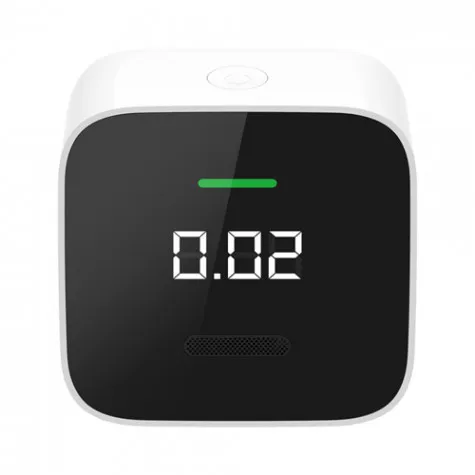 Xiaomi (Honeywell) formaldehyde sensor, OLED display, broadcasts temperature, humidity, formaldehyde concentration (mg/m³) and battery status.
